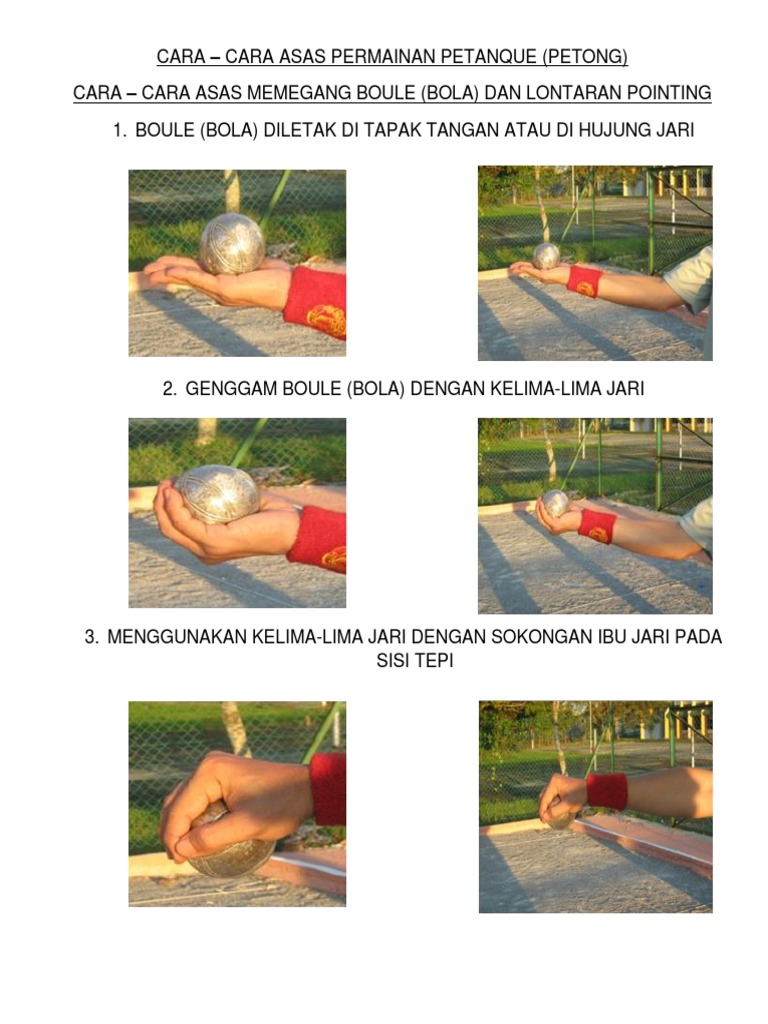 Cara bermain Petanque Pay-Tonk Boules Boolz Tempat untuk Main Petanque juga dikenali sebagai Boules dan dimainkan di luar rumah di mana-mana permukaan munasabah. Cara-Cara Asas Permainan Petanque Petong CARA-CARA ASAS MEMEGANG BOULE BOLA DAN. Merupakan teknik lemparan yang bertujuan untuk mendekati sasaran.